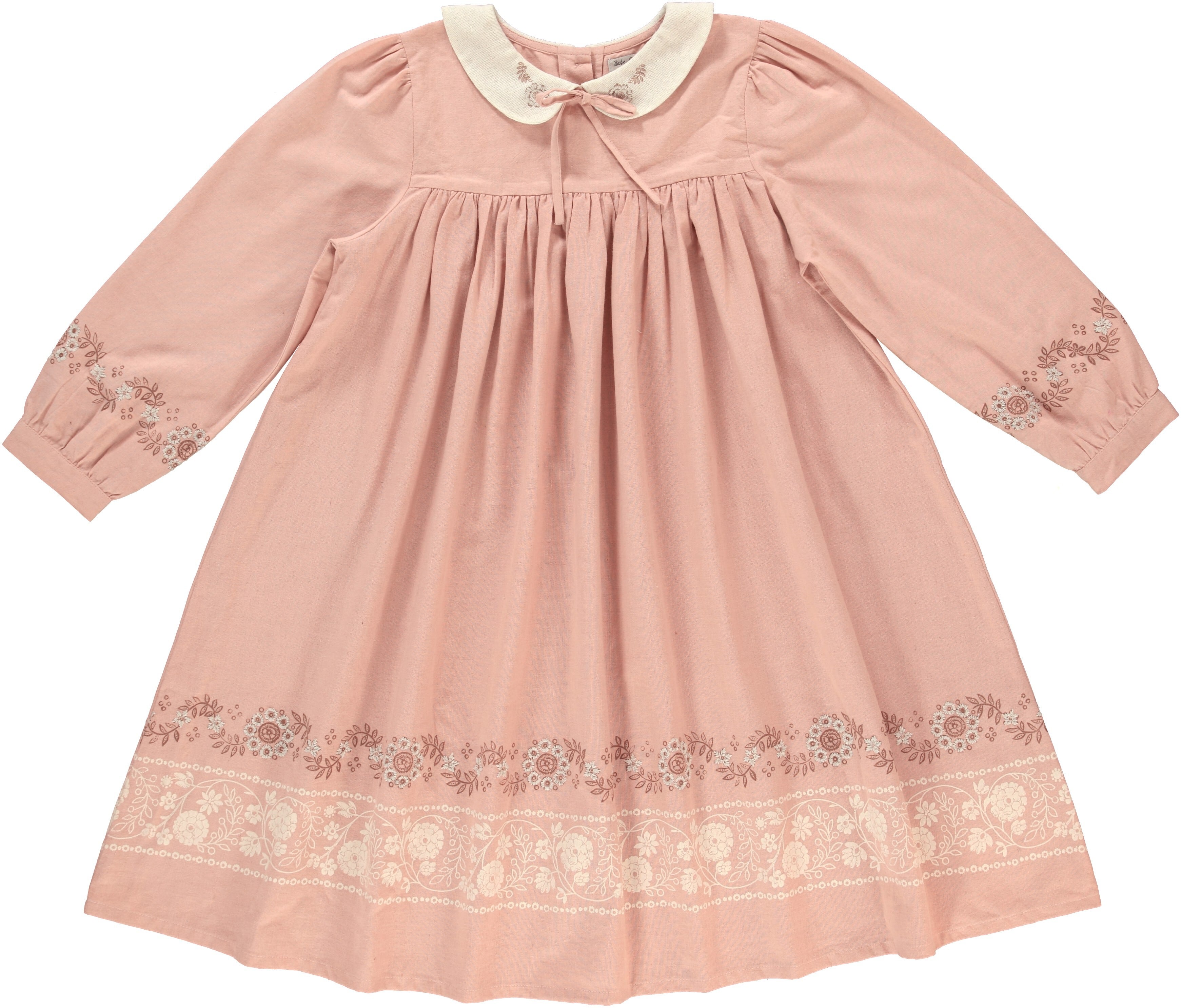 ロマンチックな夢の世界に永遠にインスピレーションを得た、ダスティ ブルーム カラーのスカーレット ドレスはオーガニック コットンで作られています。素敵なドレスは、フロントにシグネチャー刺繍とネクタイのディテールが施されたピーターパンの襟、バルーンフィットの長袖、刺繍が施された裾のゴージャスなルーズフィットシルエットが特徴です。背面はマザーオブパールボタンで閉じます。