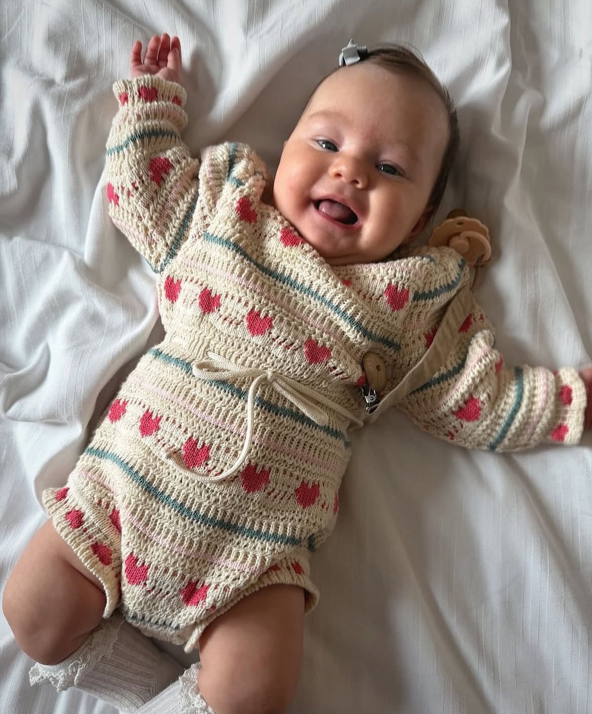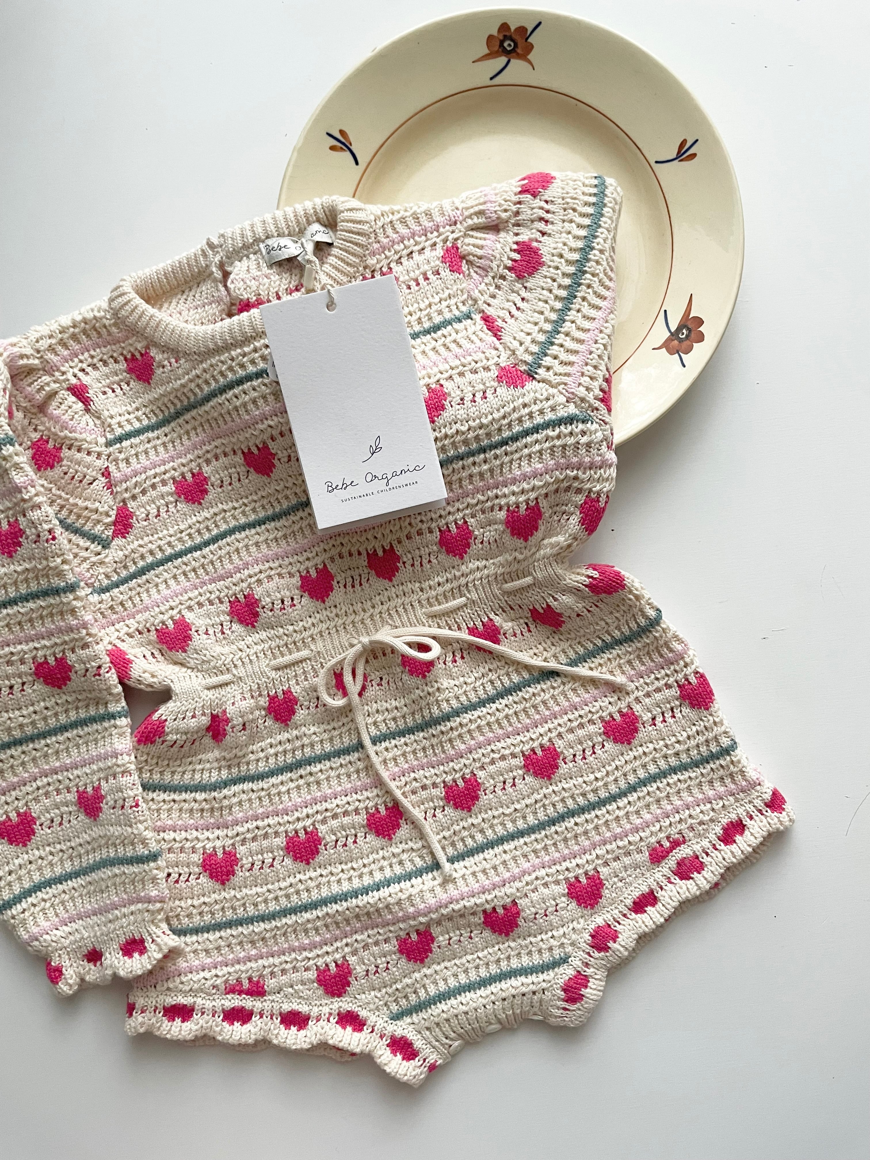 夢のニット!可愛らしいハートがあしらわれたかぎ針編みのジョシーロンパースは、ウールとオーガニックコットンの糸を混ぜて作られています。最も愛らしいロンパースは、長袖とウエストラインのドローストリングが特徴で、エレガントで快適なフィット感を実現します。お子様の秋冬のワードローブに素敵な追加アイテムです。