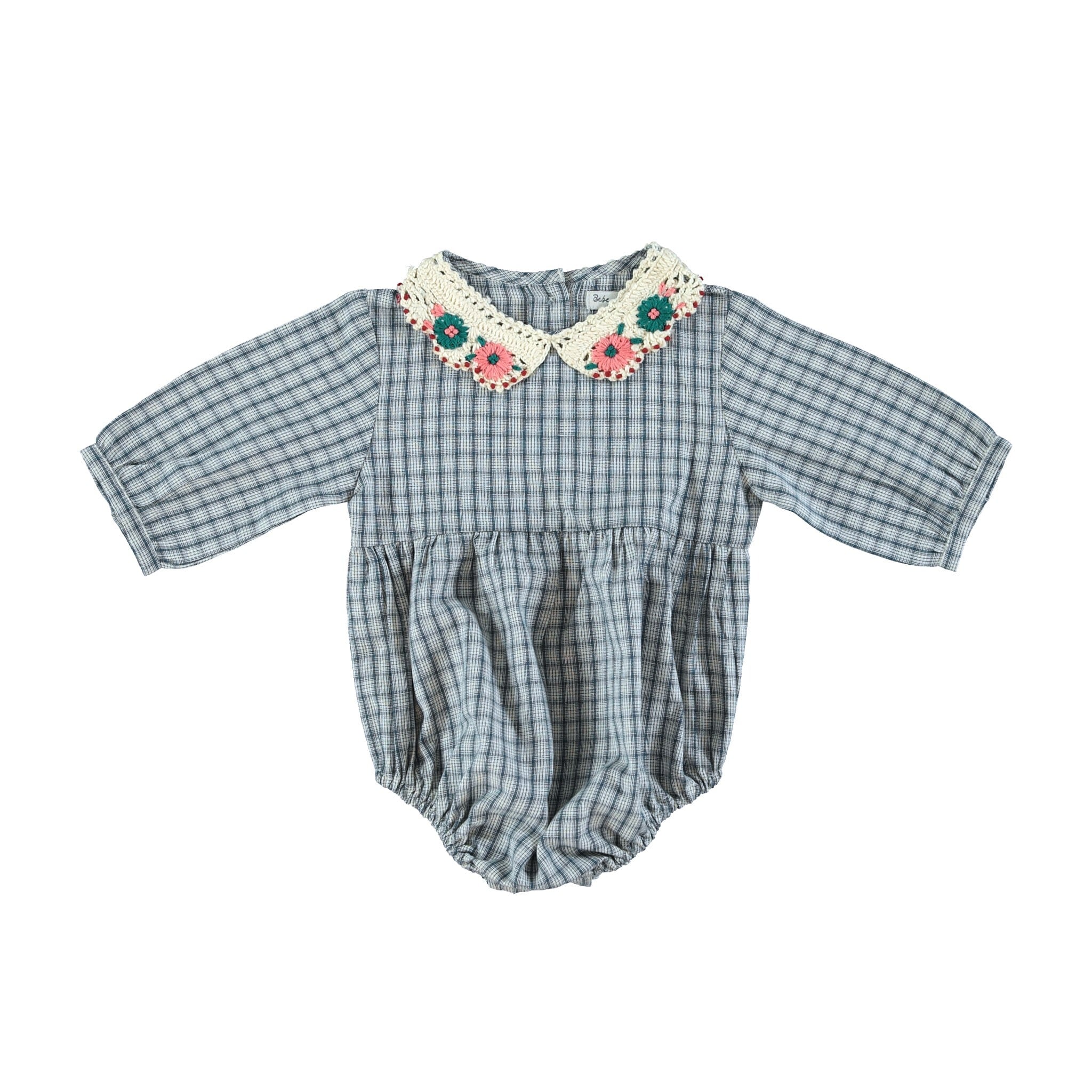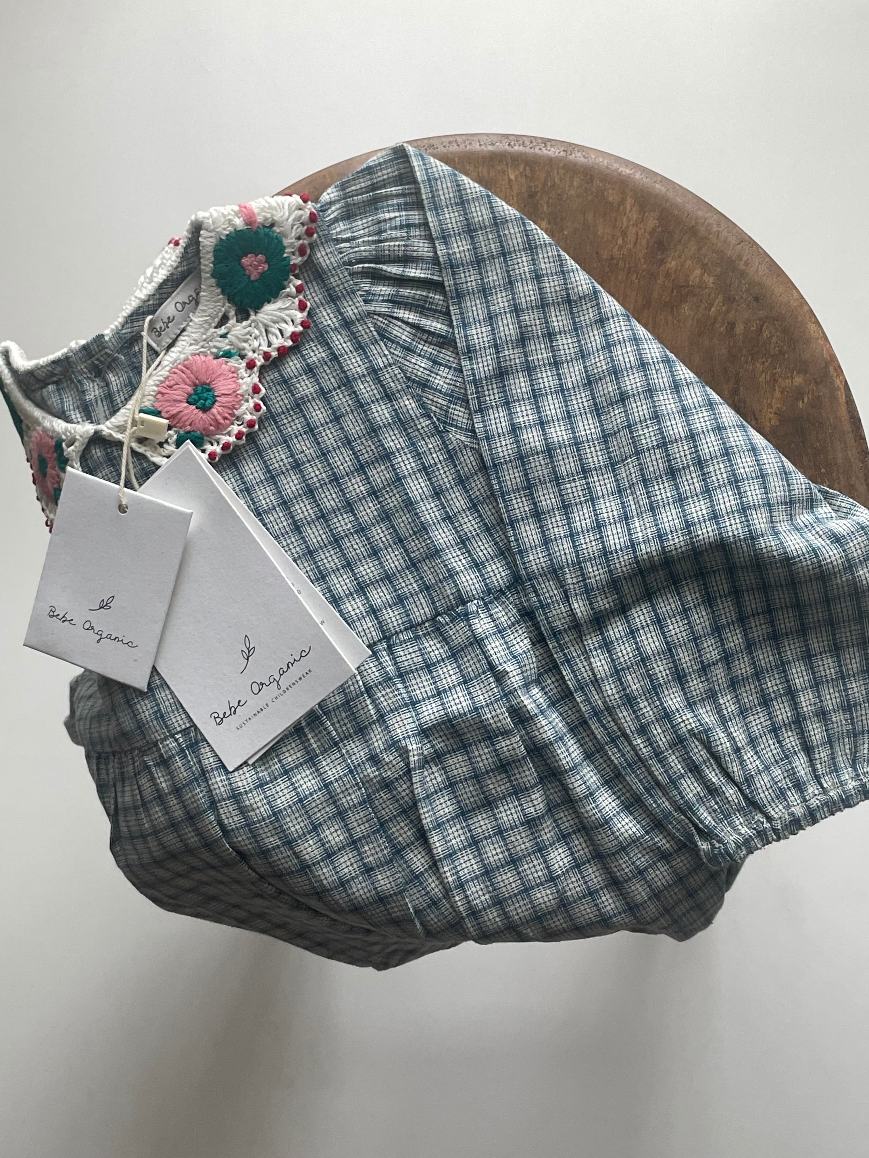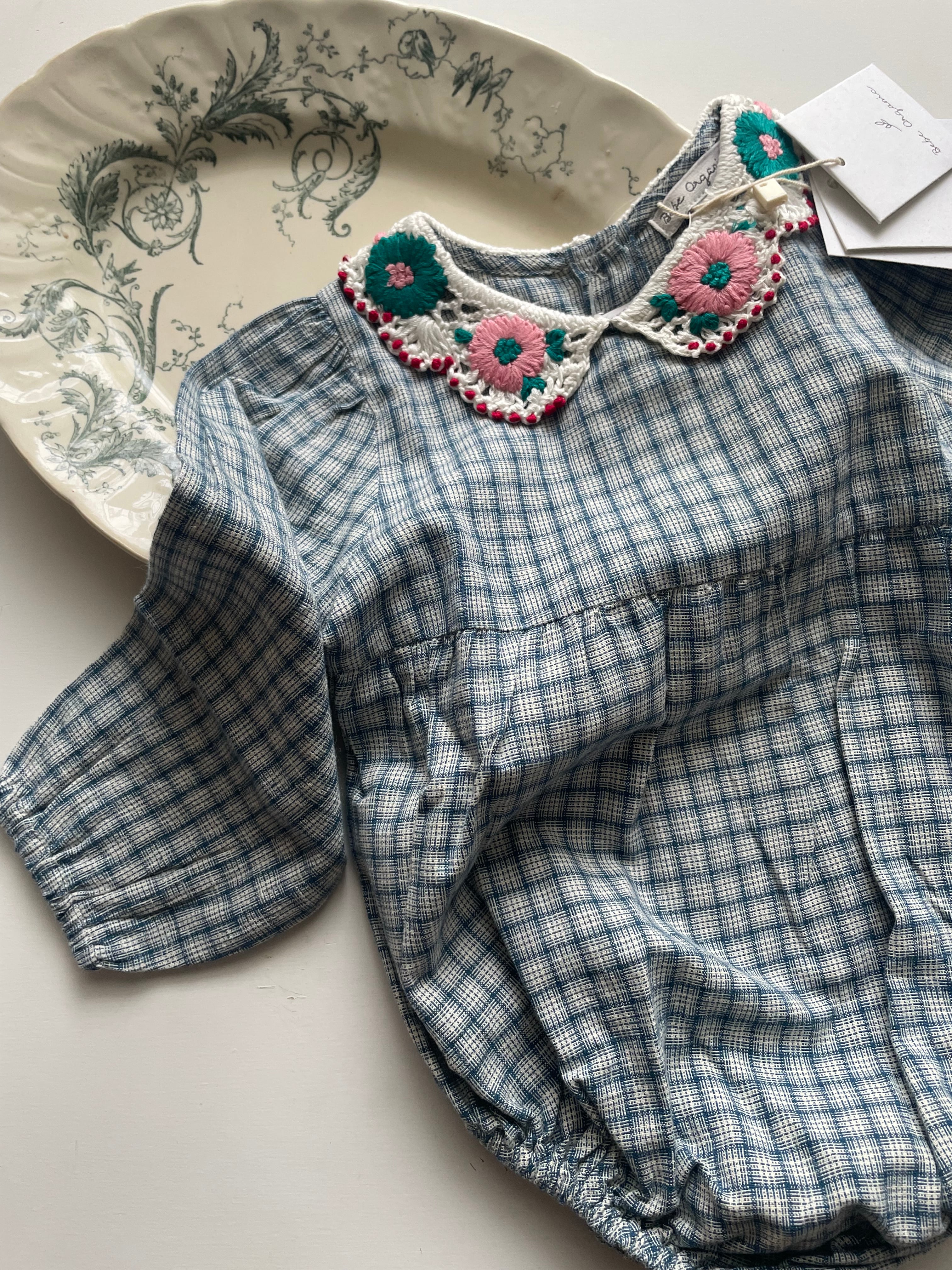 ブルーのチェックプリントの愛らしいレアロンパースは、最も柔らかいオーガニックコットンで作られています。 快適なバルーンフィット、花があしらわれたノスタルジックなかぎ針編みの襟、パフスリーブが特徴です。背面にはマザーオブパールのボタンで閉じ、脚の間にはスナップが付いており、簡単に交換できます。この秋冬シーズンのマストアイテムです。