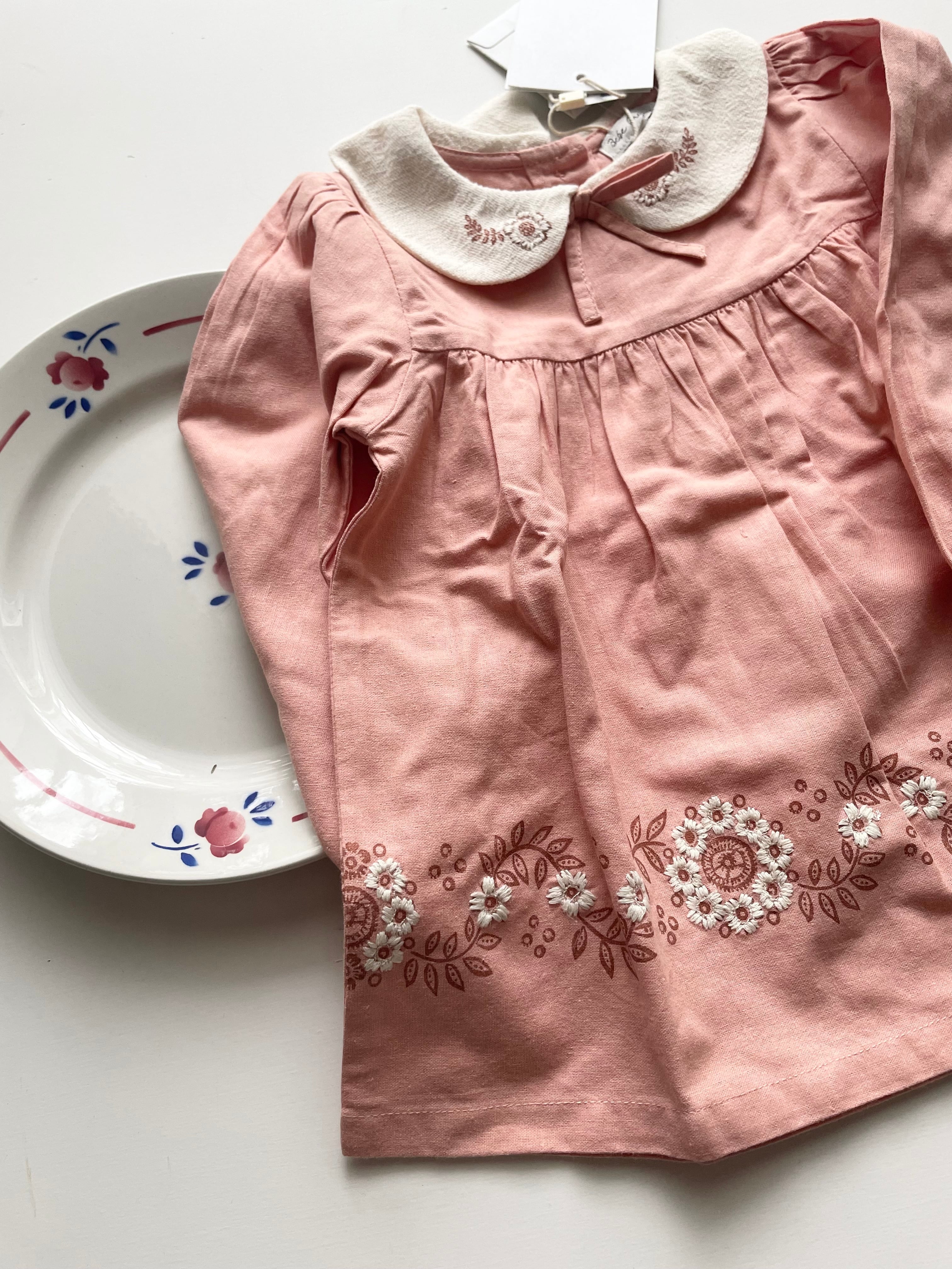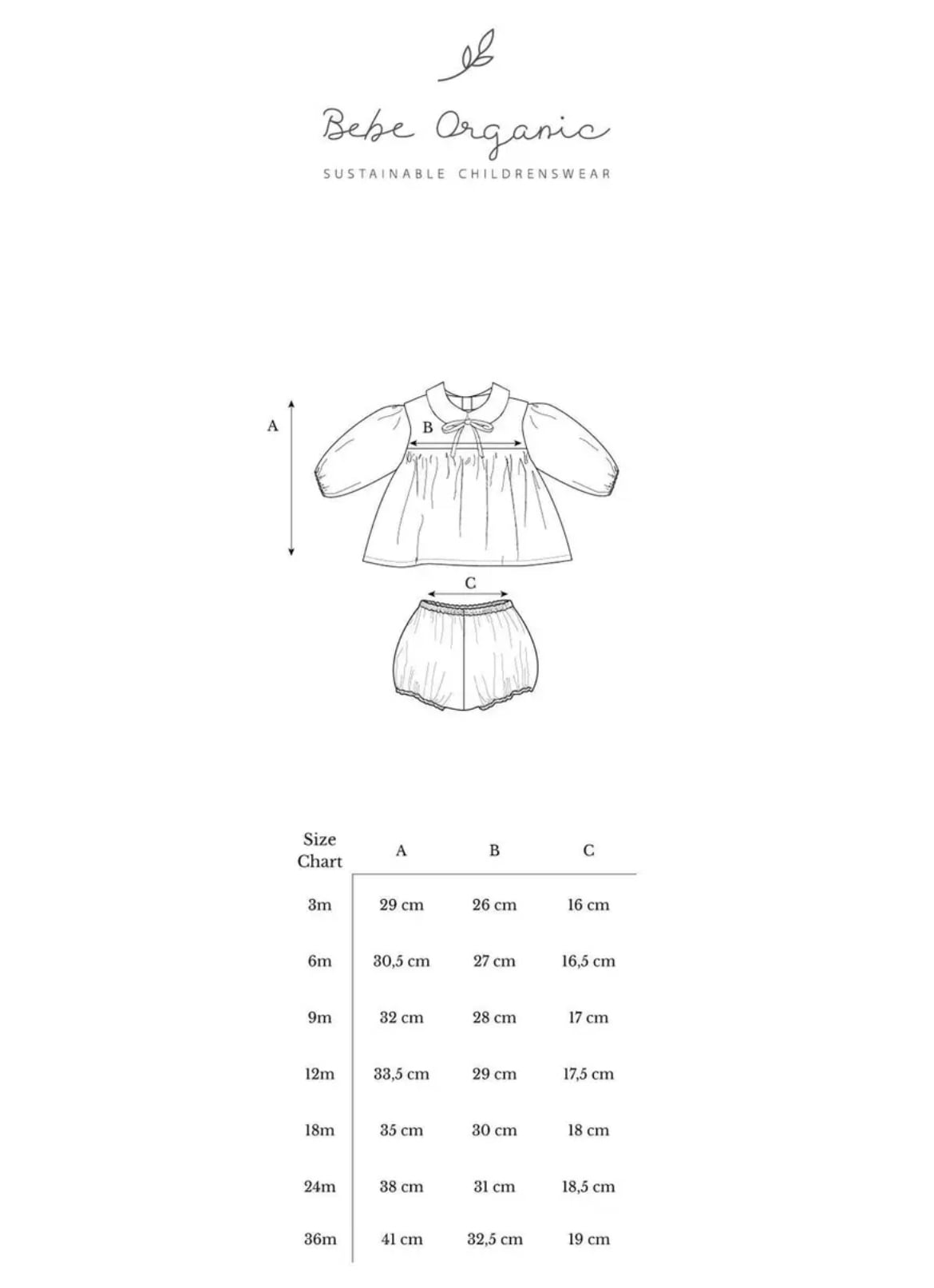 ロマンチックな夢の世界に永遠にインスピレーションを得た、ダスティ ブルーム カラーのスカーレット ベビー セットは、オーガニック コットンで作られています。セットの素敵なブラウスは、フロントにシグネチャー刺繍とネクタイのディテールが施されたピーターパンの襟、バルーンフィットの長袖、美しい刺繍が施された裾が特徴です。背面はマザーオブパールのボタンで閉じます。セットには愛らしいバルーンブルマが付属しています。お子様のワードローブに最も愛らしい追加アイテム。