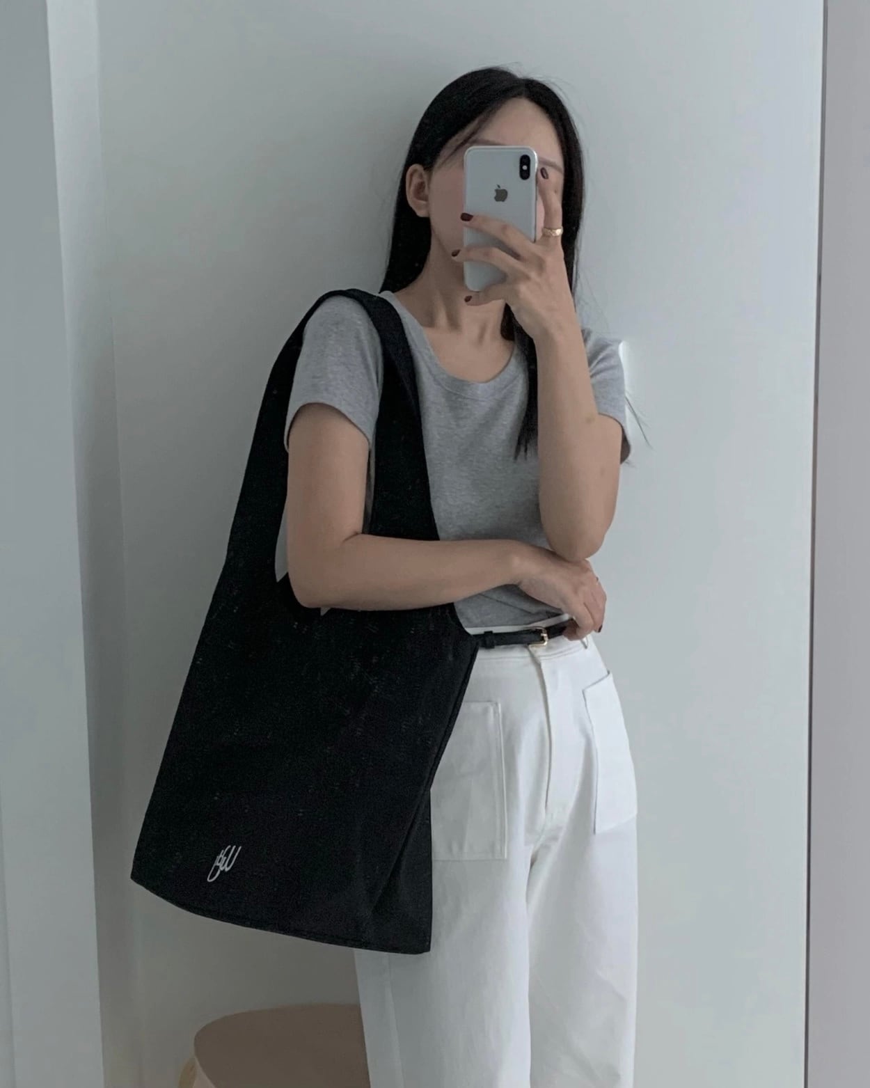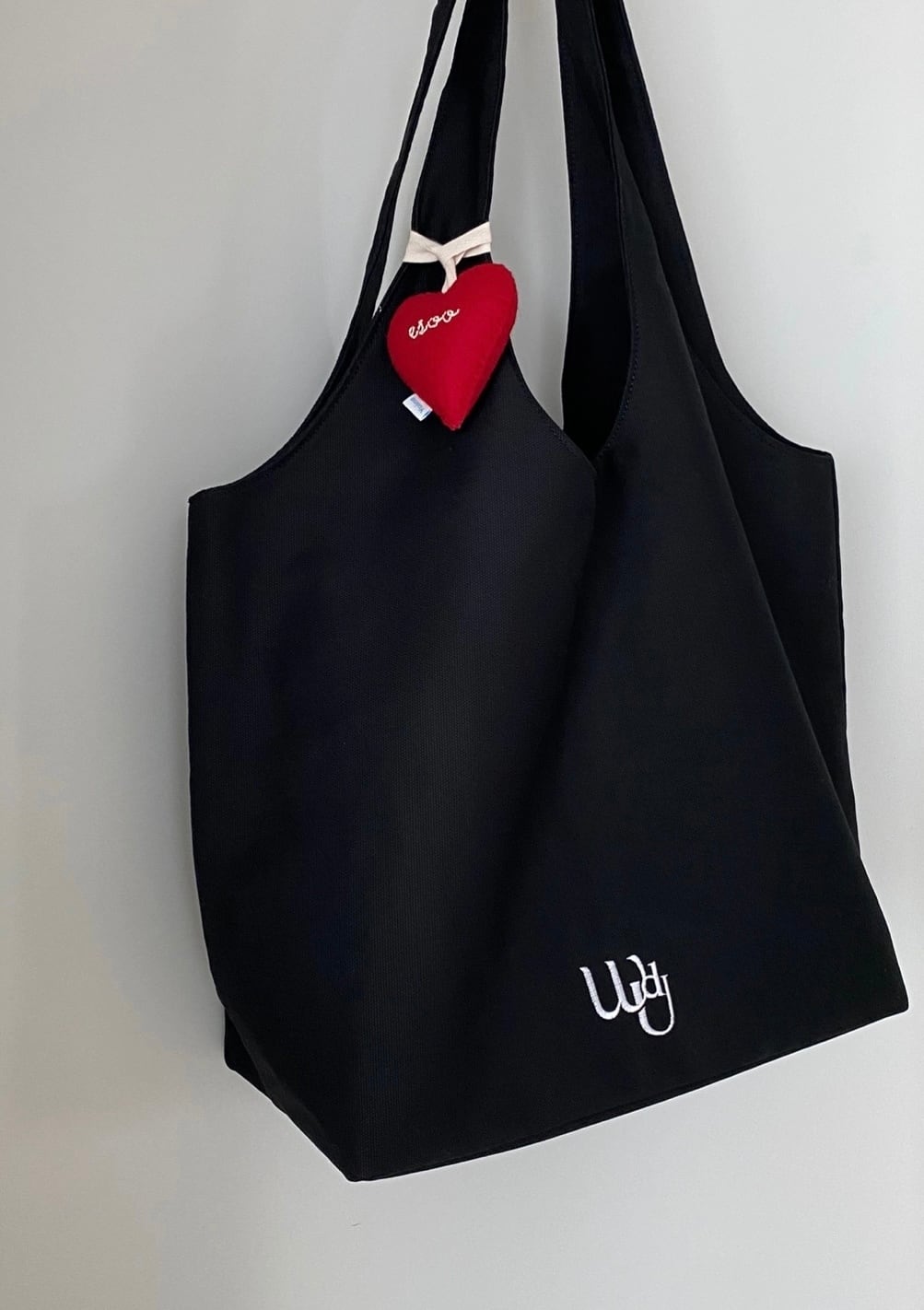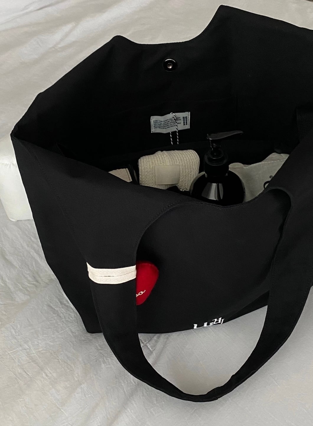 ブラックカラーの固いテクスチャーが特徴のコットン100のキャンバス生地で作られたバッグです。肩につけるショルダーで製作され、体型及び希望するフィット感によってお父さん、お母さんともに着用可能です。軽いキャンバス生地を使用し、肩紐の幅を広くして肩が楽に着用できるように製作され、長時間外出や旅行で有用に使用され、簡単な外出時にも端正でシンプルなムードで着用可能なアイテムです。ラベルがついた内側のポケットもあり、個人の持ち物を保管するのに良いです。