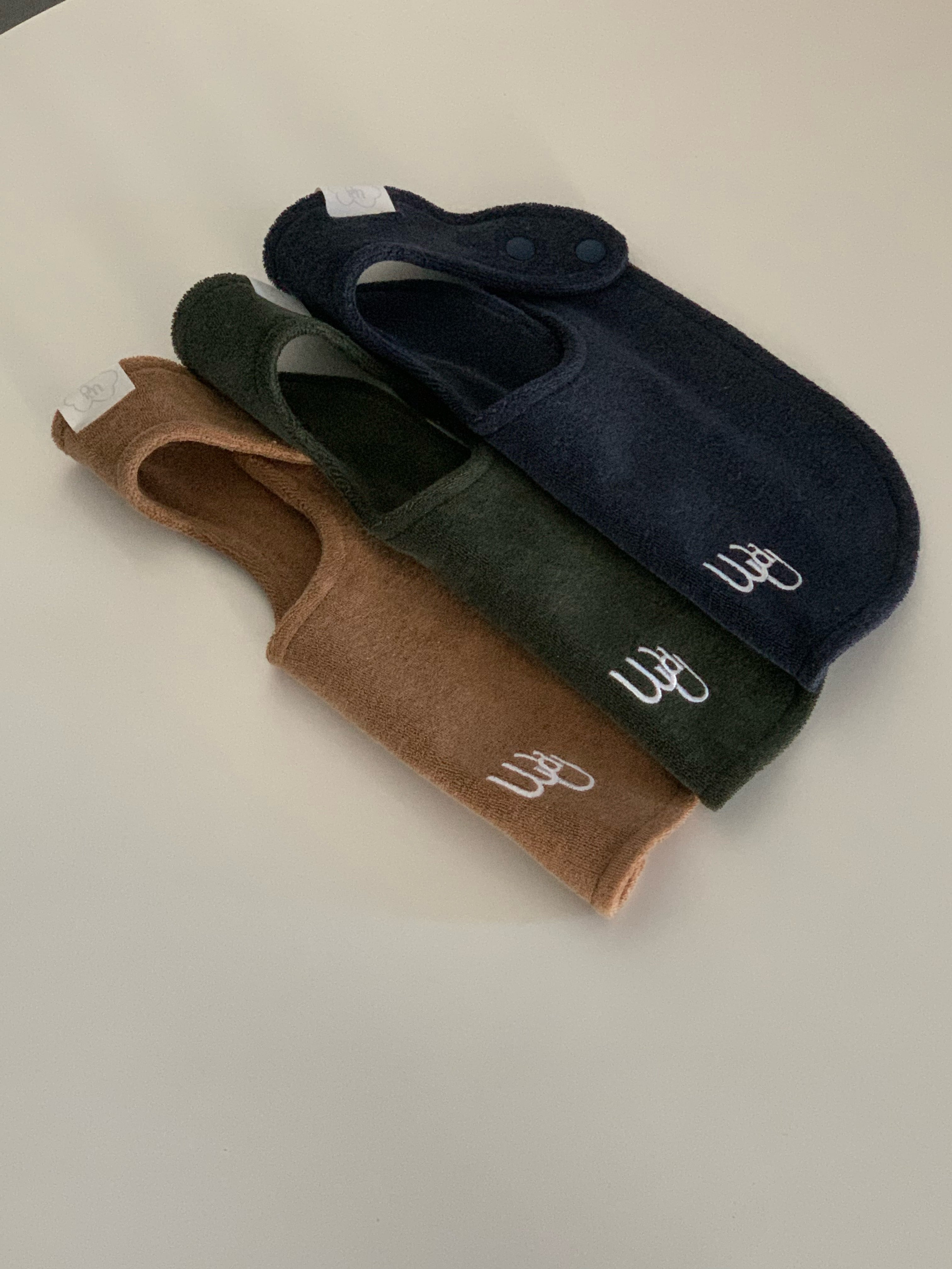 洗濯テストでも端が丸まったり変形したりしなかった「cloud terry bibs」。ロゴとラベル、そしてwould Uならではの色使いで変化をつけた、新しい感性を気に入っていただけると嬉しいです。