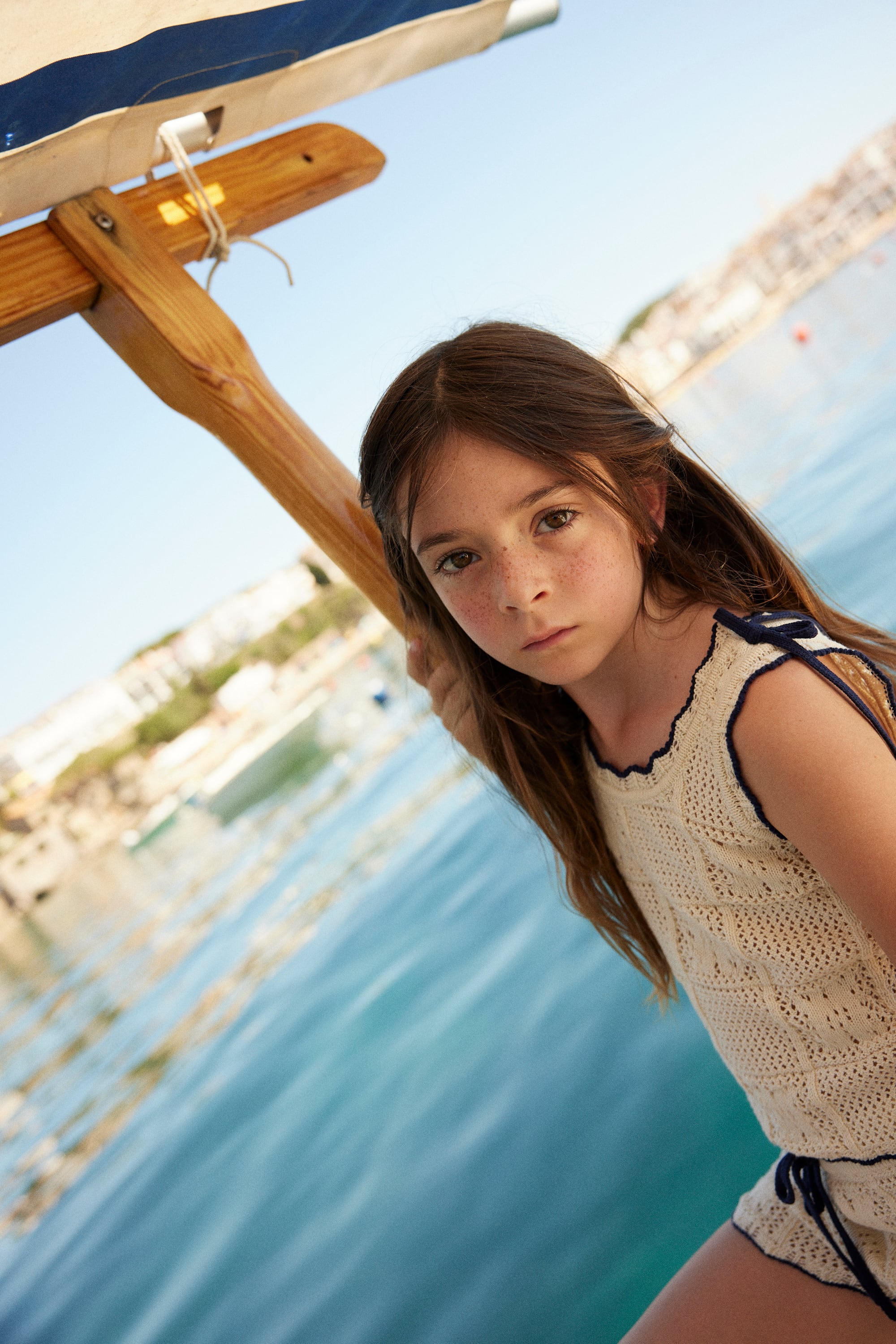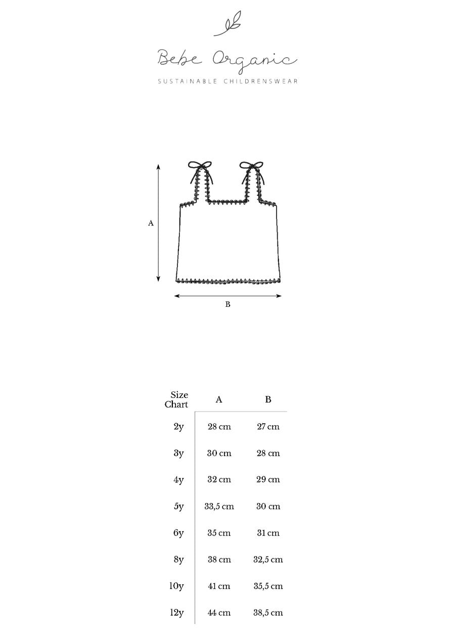 ボヘミアンな海辺の休日にインスパイアされています。エリナトップスは、柔らかい綿のかぎ針編みスタイルの生地で、この春夏シーズンにBebe Organicが特別に開発したものです。可愛らしいナチュラルニットに美しいディテールが施されており、快適なベストスタイルのシルエットと、首元と裾に最も可愛らしいコントラストのダークブルーレースのディテール、肩にかわいいリボンが施されています。エリナのショーツと完璧にマッチしています。